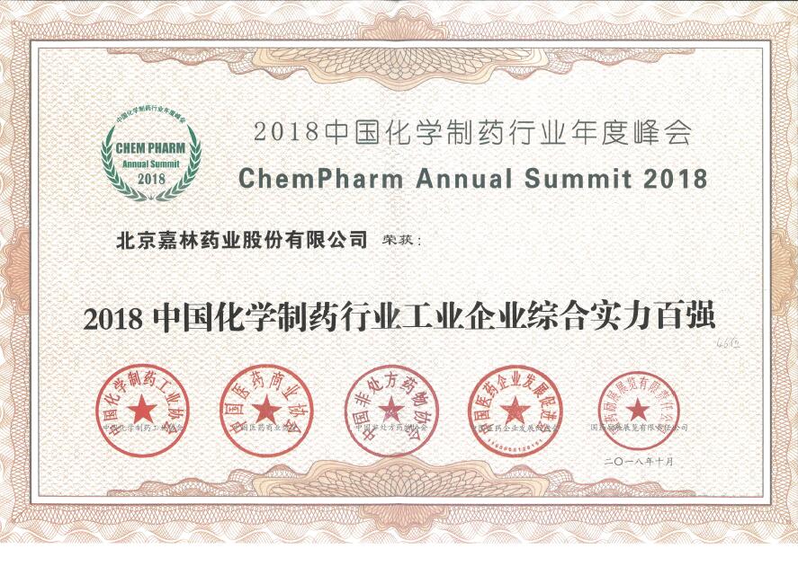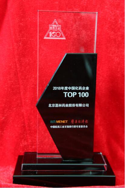 公司榮登“2018年度中國化藥企業(yè)TOP100排行榜”