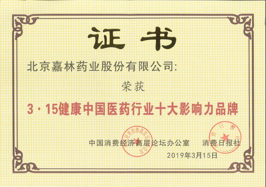公司榮獲3?15健康中國醫(yī)藥行業(yè)十大影響力品牌獎