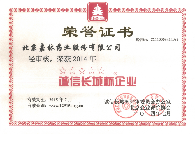 2014年9月23日,北京企業(yè)評價協(xié)會、北京市消費者協(xié)會、北京市私營個體經(jīng)濟協(xié)會、北京市場協(xié)會等15家單位聯(lián)合發(fā)起的第六屆北京企業(yè)誠信論壇在北京騰達大廈隆重召開。北京嘉林藥業(yè)股份有限公司應邀出席本次盛會,并被授予2014年首批“誠信長城杯創(chuàng)建企業(yè)”。