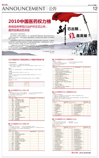 2010中國(guó)醫(yī)藥權(quán)力榜在SFDA南方所權(quán)威數(shù)據(jù)支撐下,通過(guò)醫(yī)藥行業(yè)風(fēng)云人物、新銳人物、標(biāo)志性事件、最具影響力企業(yè)、最具成長(zhǎng)力企業(yè)、最具成力品種六大榜單,從宏觀到微觀,從不同層面剖析2010年醫(yī)藥產(chǎn)業(yè)現(xiàn)狀。